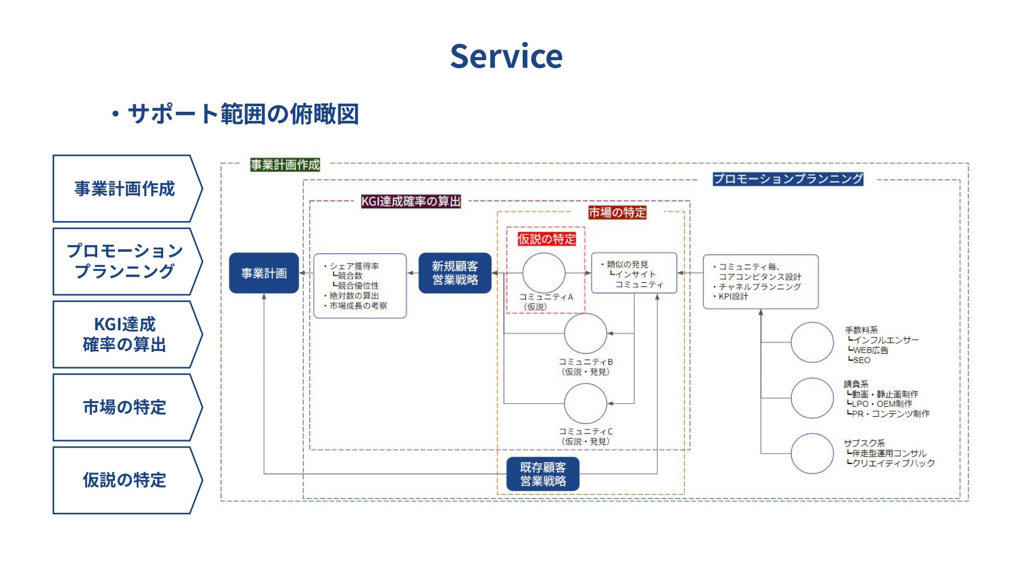 サイコグラフィック(定性)調査を起点に仮説を特定。仮説となったコミュニティから市場を考察し、 デモグラフィック(定量)調査で規模を設定。再度、サイコグラフィック調査と統計学でKGI達成確率を算出。